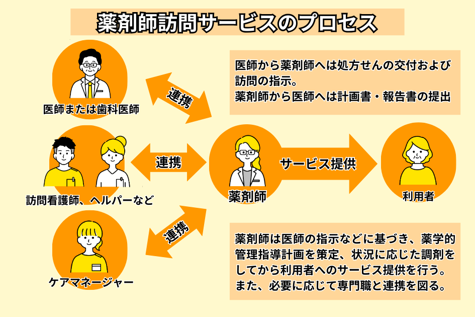 参照元:大阪府薬剤師会 薬剤師による在宅訪問、厚生労働省 薬剤師による在宅訪問、令和6年度介護報酬改定における改定事項について、在宅(その1) 在宅患者訪問薬剤管理指導について、在宅(その5)、在宅医療における薬剤師業務について、在宅における薬剤師 との連携の実際、居宅療養管理指導