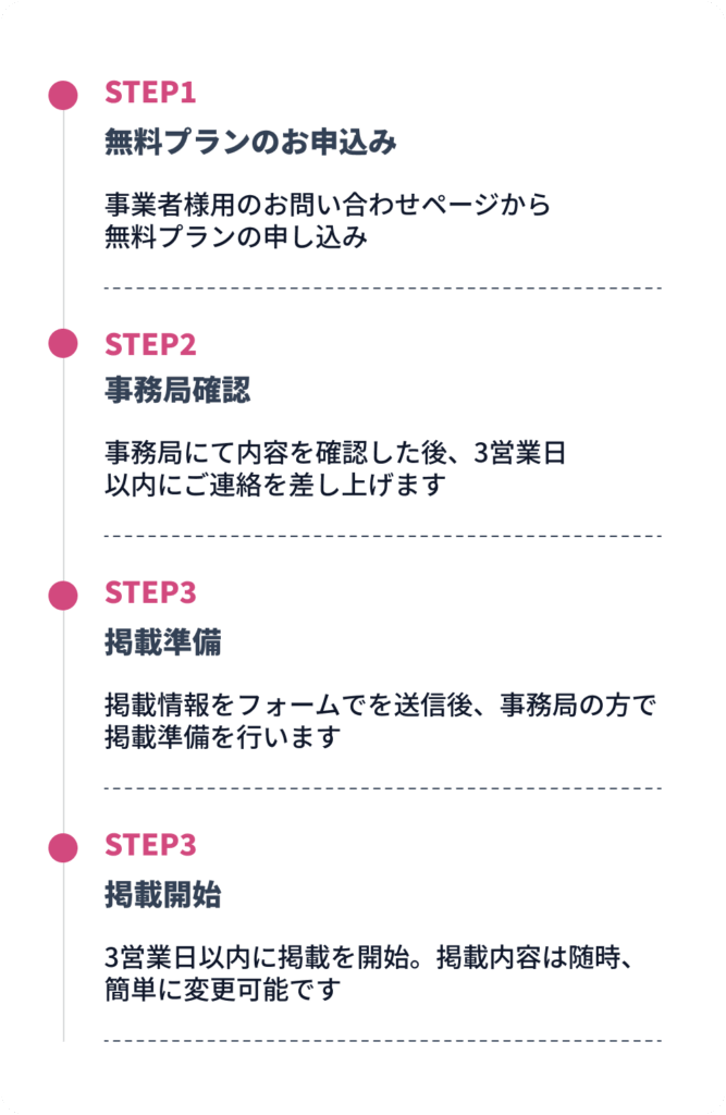 A.受け入れ可能人数や時間帯をフォームに入力するだけで事務局が掲載作業を行います。面倒な手続きはなく、どなたでも簡単にご入力いただけます。