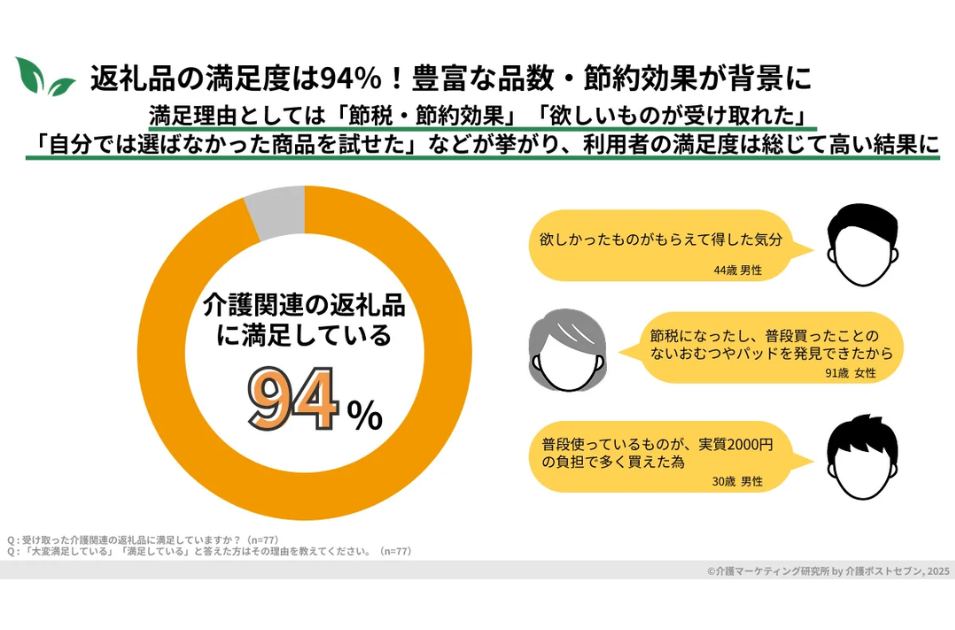 この低い利用率とは裏腹に、実際に介護関係の返礼品を申し込んだ人の94%が受け取った品に「満足している」と回答しました。