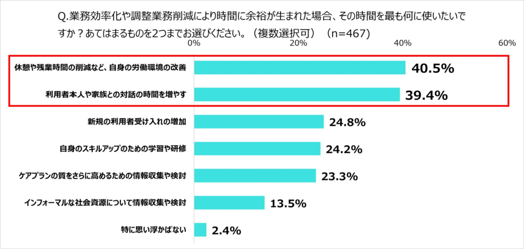 ICT導入等で余剰時間が生まれた場合の使い道として、約4割が「自身の労働環境の改善(40.5%)」、次いで「利用者や家族との対話(39.4%)」を挙げました。