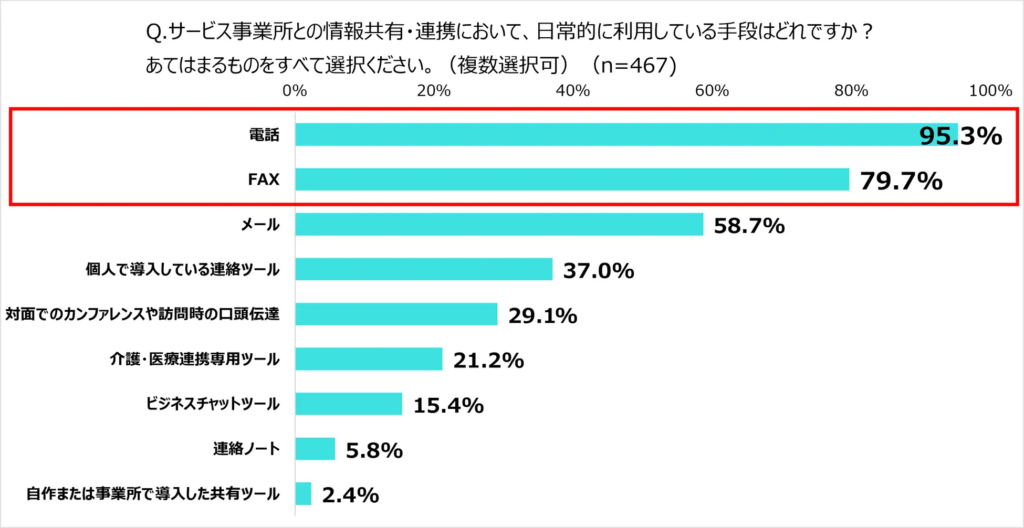 - アナログな連絡手段:連絡手段は「電話(95.3%)」「FAX(79.7%)」がいまだ主流。チャット等の非同期ツールの利用は4割以下に留まります。