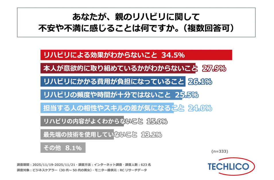 今回の結果から、介護と仕事を両立する人々がリハビリの効果を十分に把握できず、不安を抱えやすい構造が示されているようです。リハビリの“見える化”が課題であることが強く感じられました。
