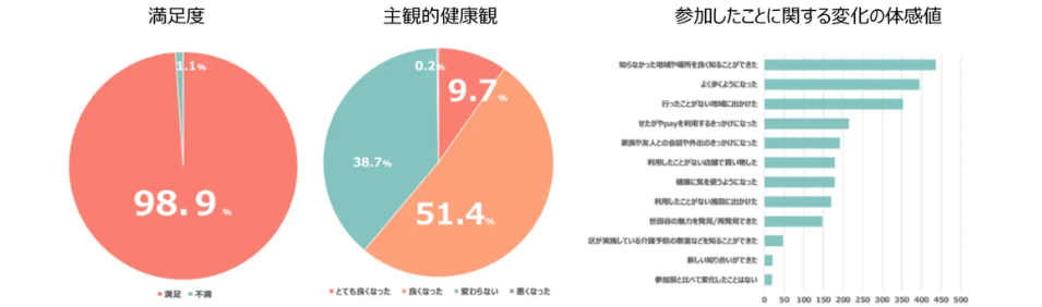 令和6年度の実績では、参加者は2,400人超、満足度は99%とされています。外出頻度が増えた人が7割を超え、健康状態の改善を実感した人も6割以上にのぼったとのことです。こうした結果は、ポイントという“軽い動機づけ”が、行動変容につながる可能性を示しています。