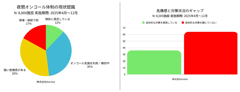 2026年1月10日、株式会社Anchorは全国8,000施設を対象とした電話調査の結果を公表しました。夜間オンコール体制について「崩壊・破綻寸前」と回答した施設は17%、「強い危機感がある」は35%に上っています。一方で、約半数の施設が「具体的な対策は講じていない」と回答しており、課題認識と行動の間に大きな隔たりがある結果となっているようです。