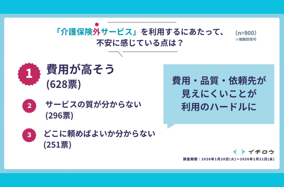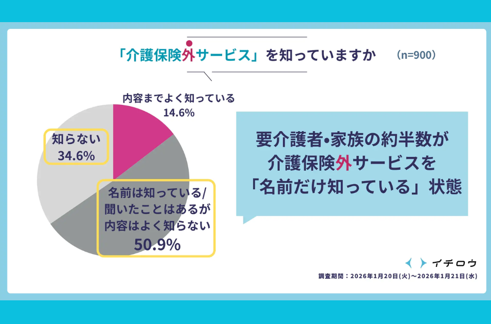 2026年2月18日、オーダーメイド介護サービス「イチロウ」を運営するイチロウ株式会社は、要介護者本人および家族900人を対象とした「介護保険外サービス」に関する意識調査の結果を公表しました。内容を「よく理解している」層は15%と少数ですが、未経験者の約4割が利用意向を示すなど、潜在的な市場の大きさが浮き彫りになっています。